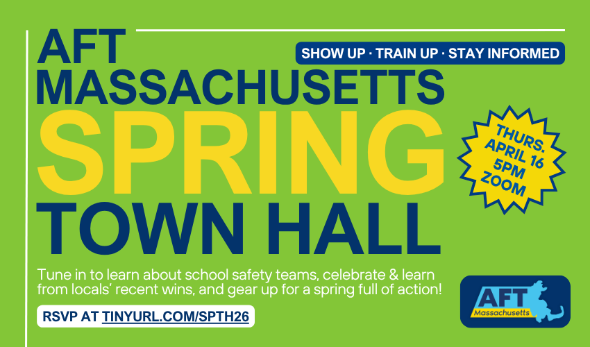 Join fellow AFT MA members from across the state to recap of our 2026 Convention, celebrate and learn from locals’ recent wins, share updates on budget and legislative fights, dive deep on school safety, and get ready for an action-packed spring.